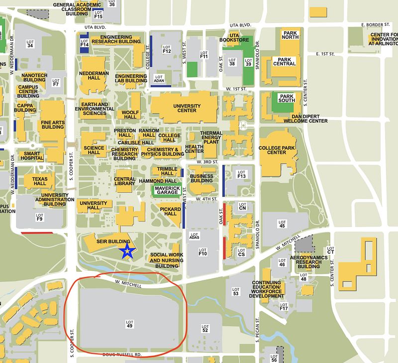 Parking is free for all non-UTA attendees. All of our events will be in the Science, Engineering, Innovation, & Research (SEIR) building, (marked with a blue star in the picture). You will be able to park in Lot 49 (circled in red), but must register first using this link: https://utarlington.aimsparking.com/permits/?cmd=new_event.